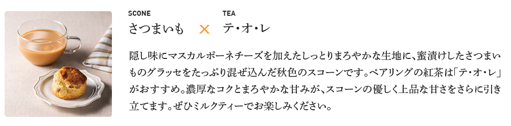 マスカルポーネチーズを使用したまろやかな生地に蜜漬けしたさつまいものグラッセを混ぜ込んで焼き上げた、優しい甘さが広がるスコーンです。