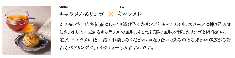シナモンを加えた紅茶液にじっくり漬け込んだリンゴとキャラメルを練り込んだ生地を焼き上げたスコーンです。ミルクティーと一緒に楽しむのがおすすめです。